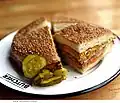 | Muffuletta | ![]() | a sesame-seed bread, or the layered New Orleans sandwich made with it, stuffed with sausage meats, cheese, olive salad, etc. |