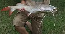 Pla sawai ปลาสวาย Iridescent shark Traditionally boiled in tom yam or fermented with pineapple as khem mak nat. Now often cut in fillets, battered and deep-fried.