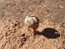 Tulostoma is a genus of over 100 species of fungi in the family Agaricaceae. Commonly known as stalked puffballs, the cosmopolitan genus consists of species which produce small fruit bodies, characterized by stalks inserted in a socket at the base of the spherical spore-sac opened by a small and apical mouth. The spore-sac contains gleba, a mixture of spores and associated cells; at maturity, the spores are released through one or more apical pores. Tulostoma species prefer xeric microhabitats, savannahs and deserts, and are saprobic—obtaining nutrients by decomposing roots, buried wood and other organic material of plant origin.[1]