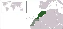 Location of Morocco (dark green) and the Western Sahara, partially controlled by disputed Sahrawi Arab Democratic Republic (light green)