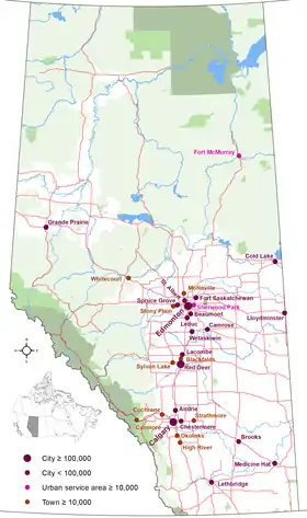 To qualify as a city in Alberta, a sufficient population size (10,000 people or more) must be present and a majority of the buildings must be on parcels of land less than 1,850 square metres (19,900 sq ft).[1] A community is not always incorporated as a city even if it meets these requirements. The urban service areas of Fort McMurray and Sherwood Park are hamlets recognized as equivalents of cities, but remain unincorporated. Ten towns are also eligible for city status but remain incorporated as towns.