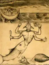 - Manu and Matsya: The legend first appears in Shatapatha Brahmana (700–300 BCE), and is further detailed in Matsya Purana (250–500 CE). Matsya (the incarnation of Lord Vishnu as a fish) forewarns Manu (a human) about an impending catastrophic flood and orders him to collect all the grains of the world in a boat; in some forms of the story, all living creatures are also to be preserved in the boat. When the flood destroys the world, Manu – in some versions accompanied by the seven great sages – survives by boarding the ark, which Matsya pulls to safety. Norbert Oettinger argues that the story originally was about Yama, but that he was replaced by his brother Manu due to the social context of the authorship of the Shatapatha Brahmana.[21]