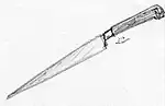 | Bread knife | To cut bread | A serrated blade made of metal, and long enough to slice across a large loaf of bread. Using a sawing motion, instead of pushing force as with most knives, it is possible to slice the loaf without squashing it. | ![]() | |