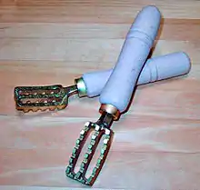 | Crab cracker | Lobster cracker | Used to crack the shell of a crab or lobster | A clamping device, similar in design to a nutcracker but larger, with ridges on the inside to grip the shell.[2] | |