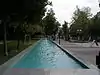 The main, outside part of the system of fountains that includes one long but narrow pool that actually runs through the main entrance hall and continues on the outside, it was constructed by Slovak company Mramor Ltd.. It is made of steel and tiles. |