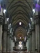 The nave is the central approach to the high altar, the main body of the church, in Romanesque and Gothic Christian abbey, cathedral basilica and church architecture. "Nave" (Medieval Latin navis, "ship") was probably suggested by the keel shape of its vaulting.[1] The nave of a church, whether Romanesque, Gothic or Classical, extends from the entry (which may have a separate vestibule, the narthex) to the chancel and is flanked by lower aisles[2] separated from the nave by an arcade.