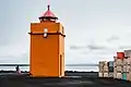 | Krýsuvíkurviti | L4826 | Suðurnes | 1965 | 61 m (200 ft) | 5 m (16 ft) | Orange cylindrical tower, red lantern house. | Active | ![]() |