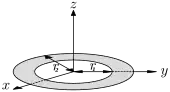 A uniform annulus (disk with a concentric hole) of mass m, inner radius r1 and outer radius r2