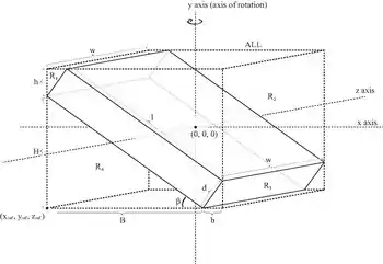 Tilted solid cuboid of depth d, width w, and length l, and mass m, rotating about the vertical axis (axis y as seen in figure).