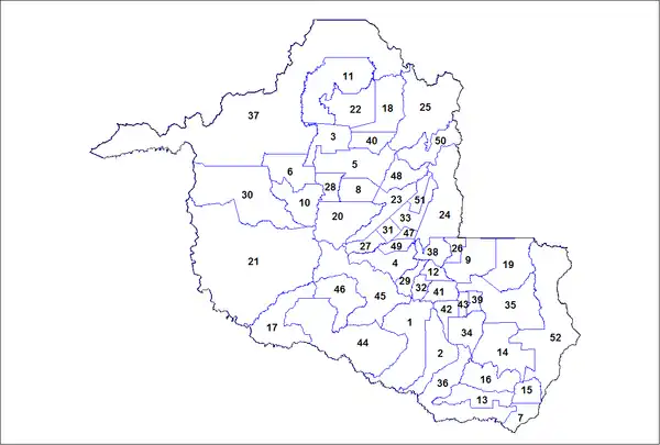 This is a list of the municipalities in the state of Rondônia (RO), located in the North Region of Brazil. Rondônia is divided into 52 municipalities, which are grouped into 6 immediate regions, which are grouped into 2 intermediate regions.[1] Of the 52 municipalities, the largest by population is its capital, Porto Velho, while the smallest is Pimenteiras do Oeste which only has 2,191 inhabitants.