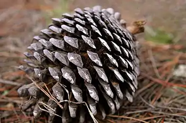 ![]() Monterey pine cone on forest floor |