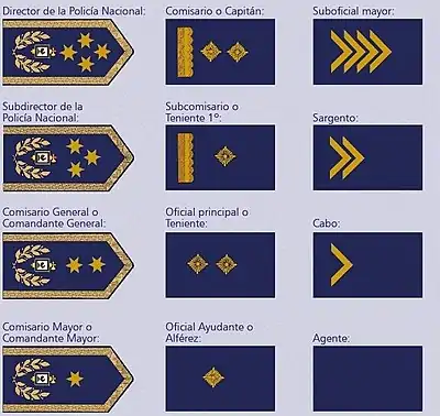 85. 1 2 "Escalafón, nombres y distintivos grados de la policia nacional" (in Spanish). Retrieved 30 March 2020.