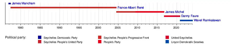 As of 2021, there is a two-term limit for the president in the Constitution of Seychelles. The term limit has not been met by any president yet.[3]