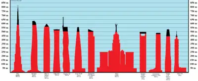 This measurement disregards distinctions between architectural and non-architectural extensions, and simply measures to the highest point, irrespective of material or function of the highest element.[10]
