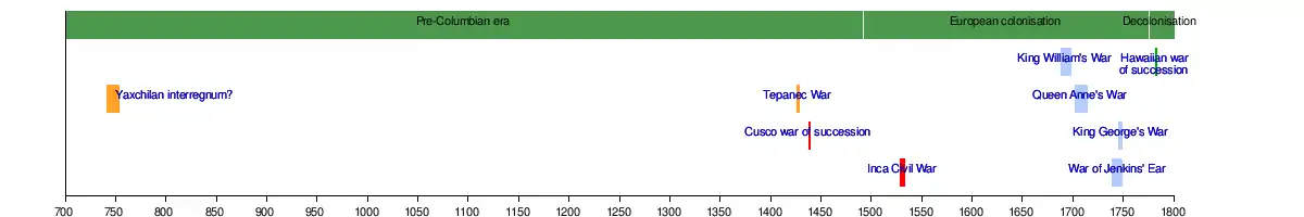 Note: Wars of succession in transcontinental states are mentioned under the continents where their capital city was located. Names of wars that have been given names by historians are capitalised; the others, whose existence has been proven but not yet given a specific name, are provisionally written in lowercase letters (except for the first word, geographical and personal names).