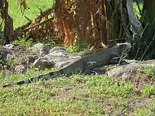 | Iguana iguana melanoderma | Saban black iguana | Regionally endemic to Montserrat and Saba. No current evidence of green iguana.[3] The Saban black iguana is darker coloured than the other subspecies of green iguana, with colouration deepening in older individuals. It possesses a noticeable black patch between the eye and tympanum. | ![]() |