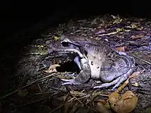 | Leptodactylus fallax | Giant ditch frog, mountain chicken | Critically endangered. Regional endemic; extant only on Montserrat and Dominica. Volcanic activity from the late 1990s through 2012 caused habitat destruction, coupled with the arrival of Batrachochytrium dendrobatidis in 2009, decimating the population. | ![]() |