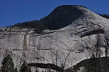 Moraine Dome is a granite dome in Yosemite National Park along the northern margin of Little Yosemite Valley at 37°44′35.15″N 119°29′24.49″W / 37.7430972°N 119.4901361°W / 37.7430972; -119.4901361 which rises to an elevation of 8,036 ft (2,449 m) AMSL, 1,906 ft (581 m) above the Merced River. Moraine Dome is notable because the presence of lateral moraines from the Merced Glacier. It is likely that these moraines represent the highest level attained by glacial ice in Little Yosemite Valley.[5] Although it is about as high as Sentinel Dome Moraine Dome is dwarfed to relative insignificance by its proximity to the bulk and elevation of Clouds Rest to the north.[5]