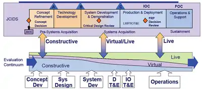 In contrast, the fidelity of M&S is highest in Live, lower in Virtual, and lowest in Constructive. As such, DoD policy is a mixed use of LVC through the Military Acquisition life cycle, also known as the LVC Continuum. In the LVC Continuum figure to the right, the JCIDS process is related to the relative use of LVC through the Military Acquisition life cycle.