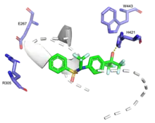 Crystal structure of human liver X receptor α (LXRα) also forms a heterodimer with its partner retinoid X receptor β (RXRβ). The LXRα-RXRβ heterodimer (PDB 1UHL) binds synthetic LXR oxysterol agonist T-0901317. The ligand-binding pocket predominantly consists of hydrophobic residues. The most critical residues to the binding pocket include E267, R305, H421, and W443. The binding pocket accommodates oxysterols of molecular volumes up to 400 Å3 and T-0901317 easily positions itself with a molecular volume of 304 Å3. H421 forms a hydrogen bond with T-0901317's hydroxyl head group which lowers the pKa of the H421 imidazole side chain. As a result, the imidazole side chain interacts electrostatically with π-electrons of W443's indole side chain to stabilize the active conformation of the helices.[9]