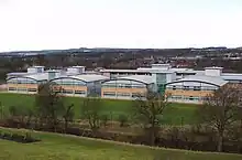 In order to build, manage, and promote Livingston, a quango organisation was formed, the Livingston Development Corporation (LDC).[25] Sir David Lowe, a local large scale farmer and businessman, was appointed chairman.[26][27] Following designation of the new town, the first large building begun was the Corporation's own offices in 1963.[21] Residential construction began in 1962 with the first homes to be built as part of the new town being constructed in Deans (to house corporation employees and construction workers).[27] The first major development of the new town took place in Craigshill, with the first people moving into the newly built housing areas in April 1966 at Broom Walk.[5][6][27] The construction of the areas of Howden, Ladywell, and Knightsridge began in the late 1960s and this was followed in the 1970s by the creation of Dedrige and further development of Deans.[27] Some of the first prominent buildings in the new town built in these decades included Riverside Primary School (the first primary school built in the new town in April 1966), Livingston Fire Station (1967 by the architects Bamber & Hall), the new town's first public house (the Tower in Craigshill built in 1968), Craigshill school (the first secondary school built in the new town in 1969), and the 'Centre' (Livingstons shopping centre) built in 1977.[27][28] Craigshill was said to exemplify the spartan, geometric approach to new town planning, with buildings composed of the Danish style Jesperson blocks and high-density, low-rise concrete homes with Scandinavian style mono-pitch roofs.[28]