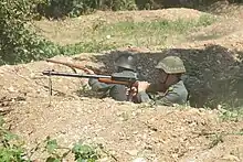 The Leichtes Maschinengewehr Modell 1925 (shortened to Lmg 25)[1] is a Swiss recoil operated light machine gun designed by Colonel Adolf Furrer of Waffenfabrik Bern in the 1920s and produced from 1925 to the 1960s.[2] It was the first machine gun in the Swiss Army that could be carried by a man. It takes the 7.5 mm Swiss Service cartridge from a 30-round box magazine and has a cyclic rate of fire of about 500 rounds-per-minute.[3] In 1957, the LMG 25 was replaced by the Stgw 57-Assault rifle.