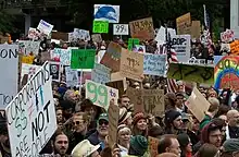 Increasingly, lobbyists seek to put together coalitions and use outside lobbying by swaying public opinion.[28] Bigger, more diverse and deep pocketed coalitions tend to be more effective in outside lobbying, and the "strength in numbers" principle often applies.[64] Interest groups try to build "sustainable coalitions of similarly situated individual organizations in pursuit of like-minded goals".[12] According to one study, it is often difficult for a lobbyist to influence a staff member in Congress directly, since staffers tend to be well-informed and subject to views from competing interests. As an indirect tactic, lobbyists can try to manipulate public opinion which, in turn, can sometimes exert pressure on congresspersons.[55] Activities for these purposes include trying to use the mass media, cultivating contacts with reporters and editors, encouraging them to write editorials and cover stories to influence public opinion, which may have the secondary effect of influencing Congress.[55] According to analyst Ken Kollman, it is easier to sway public opinion than a congressional staff member since it is possible to bombard the public with "half-truths, distortion, scare tactics, and misinformation."[55] Kollman suggests there should be two goals: (1) communicate that there is public support behind an issue to policymakers and (2) increase public support for the issue among constituents.[28] Kollman suggested outside lobbying was a "powerful tool" for interest group leaders.[28] In a sense, using these criteria, one could consider James Madison as having engaged in outside lobbying, since after the Constitution was proposed, he wrote many of the 85 newspaper editorials arguing for people to support the Constitution, and these writings later became the Federalist Papers.[8] As a result of this "lobbying" effort, the Constitution was ratified, although there were narrow margins of victory in four of the state legislatures. Lobbying today generally requires mounting a coordinated campaign, using targeted blitzes of telephone calls, letters, emails to congressional lawmakers, marches down the National Mall, bus caravans, and such, and these are often put together by lobbyists who coordinate a variety of interest group leaders to unite behind a hopefully simple easy-to-grasp and persuasive message.[28]