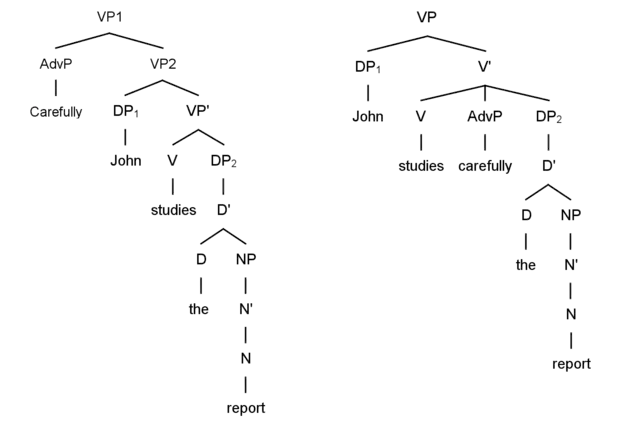 In the tree for sentence (1a), the verb, studies, is the Head of the VP projection, the DPTHEME, the report, is projected onto the Complement position (as sister to the head V), and the DPAGENT , John, is projected onto the Specifier (as sister to V'). In this way, (1a) satisfies Locality of Selection as both arguments are projected within the projection of the head that introduces them. The adverb phrase, AdvP carefully attaches as an unselected adjunct to VP; structurally this means that it is outside of the local projection of V as it is sister to and dominated by VP. In contrast, in the tree for sentence (1b), the introduction of the AdvP carefully as sister to the verb study violates Locality of Selection; this is because the lexical entry of the verb study does not select an AdvP, so the latter cannot be introduced in the local projection of the verb.