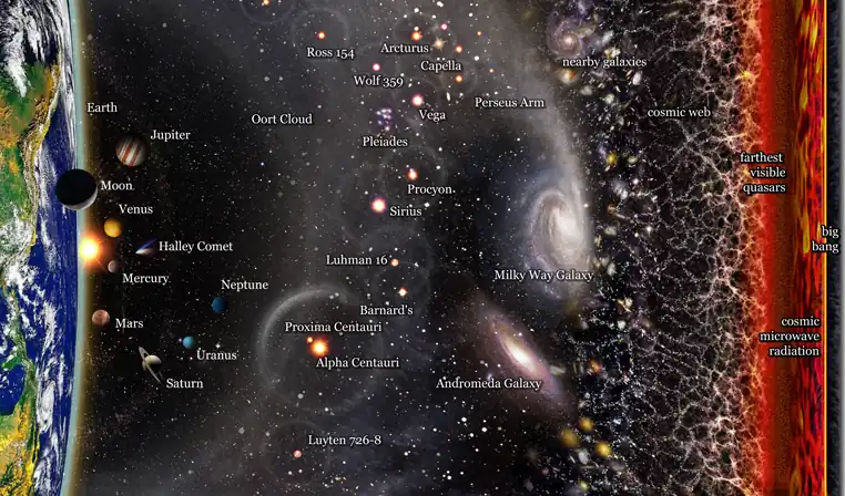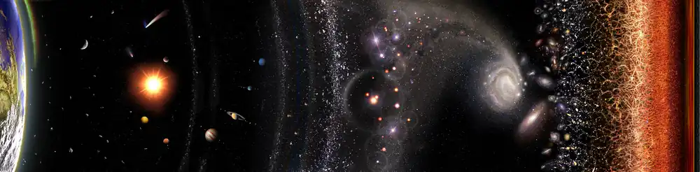 A logarithmic map of the observable universe. From left to right, spacecraft and celestial bodies are arranged according to their proximity to the Earth.