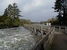 The list of locks, weirs and ferries is given in upstream to downstream order, from source to sea.[7][8] Most of the older flash locks have disappeared and there are only three ferries still operating (Weybridge, Hampton and Hammerton's). Nearly all of the older weirs and most of the current ones once had associated mills, fifteen of which are mentioned in the Domesday book, but very few of these survive.[9] A few weirs had bucks for catching eels.