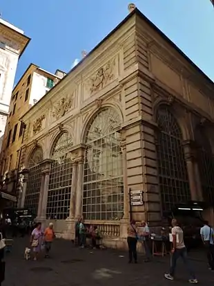A first building intended to house the trading of merchants and bankers was built in 1415. In the centre was a large stone where the cintraco, i.e. the public auctioneer, read aloud the orders issued by the authorities. The original building, seriously damaged by a fire in 1455 and subsequently restored, was replaced towards the end of the 16th century by the current one, built between 1589 and 1595, whose design is attributed to Andrea Ceresola, known as il Vannone, with the collaboration of Giovanni Ponzello. Over the years it has undergone various decorative interventions.[1][2][3][4]
