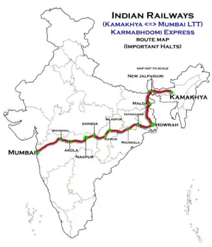 The 22511 / 22512 Lokmanya Tilak Terminus–Kamakhya Junction Karmabhoomi Express is a Superfast Express train belonging to Indian Railways Northeast Frontier Zone that runs between Lokmanya Tilak Terminus (Mumbai, Maharashtra) and Kamakhya Junction (Guwahati, Assam) in India.[1]