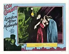 London After Midnight (original working title: The Hypnotist) is a lost 1927 American silent mystery horror film directed and co-produced by Tod Browning and starring Lon Chaney, with Marceline Day, Conrad Nagel, Henry B. Walthall and Polly Moran. The film was distributed by Metro-Goldwyn-Mayer, and was written by Waldemar Young, based on the story "The Hypnotist" which was written by Browning. Merritt B. Gerstad was the cinematographer, and the sets were designed by Cedric Gibbons and Arnold Gillespie.[7] Harry Sharrock was the assistant director. The film cost $151,666.14 to produce, and grossed $1,004,000. Chaney's real-life make-up case can be seen in the last scene of the film sitting on a table, the only time it ever appeared in a movie.
