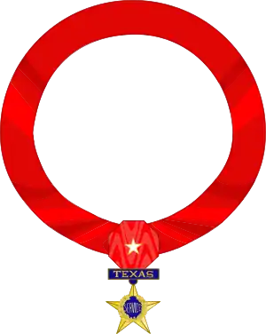 The medal pendant is a brushed gold five-pointed star with one point up, 1-1/2 of an inch in circumscribing diameter. In the raised center of the star is the inscription "SERVICE" on a royal blue field, encircled by a live oak branch with acorns on the wearer's right and an olive branch with olives on the wearer's left. The star is suspended by one link from a brushed gold bar, 1-3/8 of an inch long and 9/32 of an inch high, bearing the inscription "TEXAS" in raised brushed gold letters on a field of royal blue. The reverse of the medal pendant and bar is blank. The pendant is suspended by a metal loop attached to a burnt red moiré silk neckband 1-3/8 of an inch wide and 24 inches long, behind a hexagonal pad in the center made of matching ribbon. A white enameled five pointed star, trimmed in gold and 3/8 of an inch in circumscribing diameter, is centered on the hexagonal pad, one point up.[2]