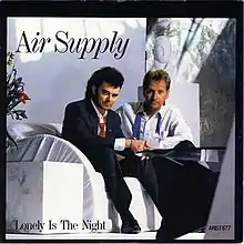 "Lonely Is the Night" is a song by Australian-British band Air Supply, released in 1986, as the lead single from their ninth studio album, Hearts in Motion (1986). The ballad was written by Albert Hammond and Diane Warren, while John Boylan produced it. "Lonely Is the Night" was a minor success in the United States, reaching number 76 on the Billboard Hot 100 but find better success on the Adult Contemporary chart, reaching at number 12.