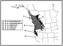 Thompson and Russell found another evolutionary lineage that originates in a glacially restricted area of the Salmon River Mountains, Idaho.[11] With the arrival of the Holocene interglacial, approximately 10,000 years ago, the Pleistocene glaciers receded and opened a migratory path linking these southern populations to northern areas where they currently overlap with A. m. krausei and co-migrated north into the Peace River (Canada) Valley.[11] Ferguson also noted an intergradation in the same geographic area, but between the morphological subspecies A. m. columbianum and A. m. krausei that run parallel to the Bitterroot and Selkirk ranges.[18] Thompson and Russell suggest that this contact zone is between two different subspecies lineages because the A. m. columbianum lineage is geographically isolated and restricted to the central Oregon Mountains.[11]