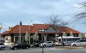 Due to repeated storm damage to rails and other equipment, the LIRR petitioned the New York State Public Service Commission to move the station 1000 feet north in January 1909, which was fully endorsed by the Estates of Long Beach who even offered to exchange land with the railroad.[9] That permission was granted in February of the same year. The present depot at Park Avenue was built in June 1909, and is larger than the previous station off the Atlantic Coast. It was designed by Kenneth M. Murchison, who also designed the 1913-built Jamaica station[10] and Hoboken Terminal. Over a year later, the station and the line were electrified. The station was renovated in 1988. Another renovation in the early 2000s added a parking garage, bus depot, and platform bridge. The bus depot is on Centre Street adjacent to the station building, and the parking garage contains a section for bicycles.