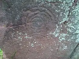 The Long Meg monolith has motifs on the face looking towards the circle arranged in three sections. The markings include: in the centre, a cup at the centre of three rings, a spiral of four turns and various concentric arcs; in the lower section, three faint figures at the left-hand corner, an anti-clockwise spiral, cup and ring and various concentric arcs; in the upper section are faint rings, ovoids, spirals and other markings. Some of the stones in the circle itself have artificial markings on them as well.[15]