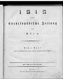 In 1816 Oken began publication of his well-known periodical, Isis, eine encyclopädische Zeitschrift, vorzüglich für Naturgeschichte, vergleichende Anatomie und Physiologie. In this journal appeared essays and notices on the natural sciences and other subjects of interest; poetry, and even comments on the politics of other German states, were occasionally admitted. This led to representations and remonstrances from the governments criticized or impugned, and the court of Weimar called upon Oken either to suppress Isis or resign his professorship. He chose the latter alternative. The publication of Isis at Weimar was prohibited. Oken made arrangements for its issue at Rudolstadt, and this continued uninterruptedly until the year 1848.[1]