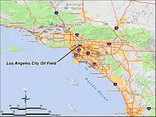 ![]() The Los Angeles City Oil Field in the Los Angeles Basin of southern California. Other oil fields are shown in light gray. | |