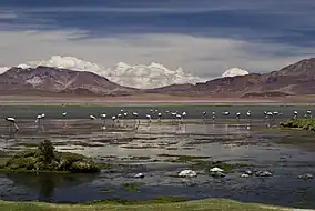 The Soncor area includes the Chaxa, Puilar and Barros Negros lagoons. Despite the extreme conditions, the Salar de Atacama sustains a wide variety of species including Chilean and Andean flamingos (the latter using it as an important nesting site), the Andean avocet, the yellow-billed teal, the crested duck, the puna plover and Baird's sandpiper.[13] Various plant species ground around the edges of the lagoons, such as Distichlis spicata, Ephedra and cachiyuyo (a species of the genus Atriplex), among others. The Sistema hidrológico de Soncor (Soncor hydrological system), like the Salar de Tara, is a Ramsar protected site. It comprises four shallow salt lakes.[15]