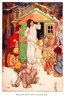 ![]() The Lost Boys and Peter Pan after building a house for Wendy. Illustration by Alice B. Woodward. | |