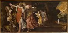 The story, usually called Lot and his daughters, has been the subject of many paintings over the centuries, and became one of the subjects in the Power of Women group of subjects, warning men against the dangers of succumbing to the temptations of women, while also providing an opportunity for an erotic depiction. The scene generally shows Lot and his daughters eating and drinking in their mountain refuge. Often the background contains a small figure of Lot's wife, and in the distance, a burning city.[19]