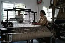 Lotus silk (Burmese: ပိုးကြာချည် or Burmese: ကြာချည်, lit. 'lotus thread') is a type of textile produced using delicate lotus stem fibers. The fabric first originated in Myanmar (Burma), and is now also woven by smaller-scale cottage industries in Vietnam.[1][2] Due to the complexity and labor-intensive nature of weaving lotus fibers, lotus silk is considered one of the most expensive fabrics in the world.[1][3] Burmese lotus silk uses fibres from a specific variety of lotus called padonma kya (ပဒုမ္မာကြာ), which produces large, fragrant pink flowers.[4]