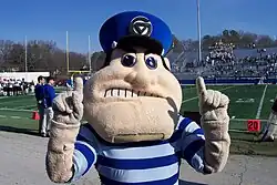 Louie the Laker is the mascot of Grand Valley State University, located in Allendale, Michigan. The costume of Louie consists of a large cartoonish face with an oversized jaw, a scowl, a blue and white striped shirt, blue pants, a blue captain's hat, and large black boots. He is seen at all football games as well as randomly around campus during events. According to short videos shown at Laker football games, Louie the Laker sleeps on the 50 yard line and dreams of Laker football.