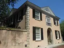 The Louis Gourd House is a Victorian house in Charleston, South Carolina which was once the carriage house of the Calhoun Mansion.[1] The house, built in the 1870s, once included eight stalls, space for carriages, and servants' quarters, but the interior was entirely removed as part of the building's conversion into a residence.[1] The Church Street portion of the lot was divided off from the Calhoun Mansion (facing on Meeting Street) and sold separately for the first time in 1932.[1] When the building was acquired by Mr. and Mrs. Louis Gourd in 1939, they quickly hired Charleston architect Albert Simons to plan to remodeling of the building.[1] The house he designed includes a main hall, living room, dining room, kitchen, gun room, and maid's quarters on the first floor with additional bedrooms and baths upstairs.[1] Ironwork on the front and rear of the house was designed by Mr. Simons and includes his initials in the corners.[1]
