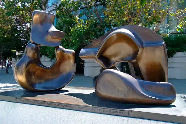 A Henry Moore bronze sculpture, Large Four Piece Reclining Figure 1972–73 (1973), is displayed outside the hall at the corner of Grove Street and Van Ness Avenue.