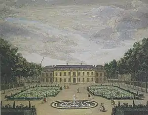 Louise d'Épinay was born at the fortress of Valenciennes. She was the daughter of Tardieu d'Esclavelles, a brigadier of infantry and commanding officer, and Florence-Angélique Prouveur. After her father was killed in battle when she was ten, she was sent to Paris in the care of her aunt Marie-Josèphe Prouveur who was married to Louis-Denis de La Live de Bellegarde, an immensely wealthy fermier-général, a collector-general of taxes; treated to the stultifying education that was a girl's lot, on 23 December 1745 she married her cousin Denis Joseph de La Live d'Épinay,[3] who was made a fermier-général.[4] The marriage was at once an unhappy one; and the prodigality, dissipation and infidelities of her husband justified her in obtaining a formal separation of assets[5] in May 1749. She settled in the Château of La Chevrette in the valley of Montmorency, a few miles north of Paris, and there received a number of distinguished visitors.