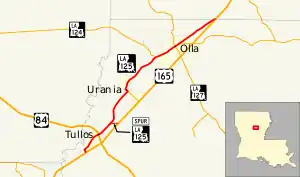 Like the current LA 125 Spur, the route was created shortly after the 1955 Louisiana Highway renumbering when US 165 was moved onto its present route bypassing the nearby town of Tullos.[13][15] Before the bypass was opened, LA 125 began at the present intersection of US 165 and LA 3259. It followed LA 3259 into town where it joined the current route and proceeded northeast toward Olla.[3][14] After the re-routing of US 165, LA 125 was extended over its former route through Tullos.[13][15] The connection between US 165 and Urania became a spur route of LA 125 until 1991, when it was renumbered to LA 3259 due to its close proximity to the other LA 125 Spur near Tullos.