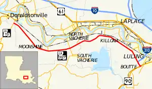 Louisiana Highway 3127 (LA 3127) is a state highway in Louisiana that serves Ascension, St. James, St. John the Baptist, and St. Charles Parishes. It spans 42.1 miles (67.8 km) in a northwest to southeast direction.[1] It parallels LA 18 along the west bank of the Mississippi River, providing a much shorter inland bypass of the River Road. It is bannered in all four cardinal directions depending upon the part of the route.